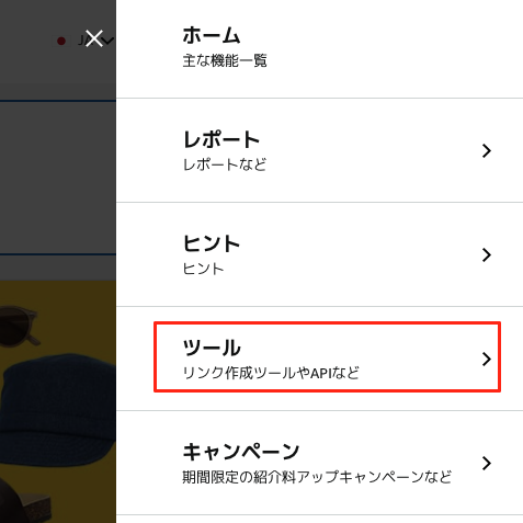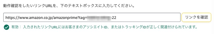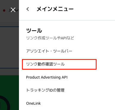 Amazonアソシエイトのサイト上部の[三]メニューをクリックし、「ツール」>「リンク動作確認ツール」をクリックします。