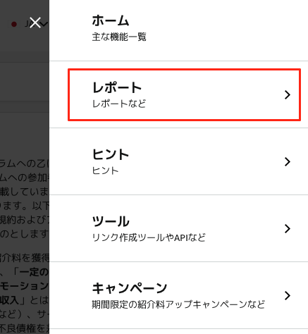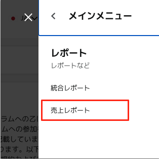 また、サイト上部の[三]メニューをクリックし、「レポート」 > 「売上レポート」をクリックすると、