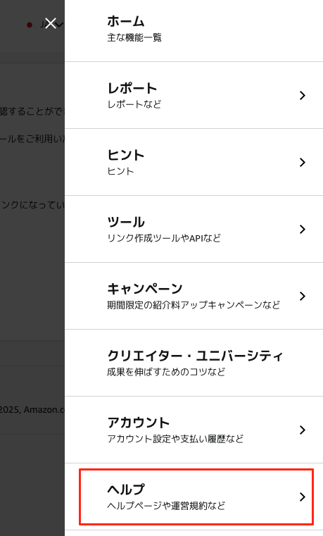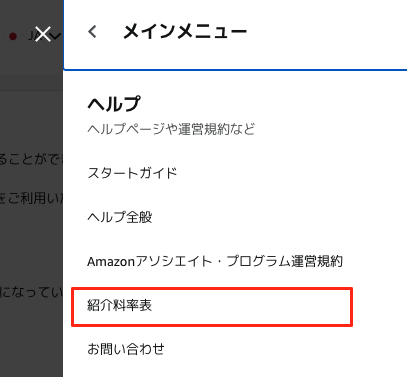 Amazonアソシエイトのサイト上部の[三]メニューをクリックし、「ヘルプ」>「紹介料率表」をクリックします。